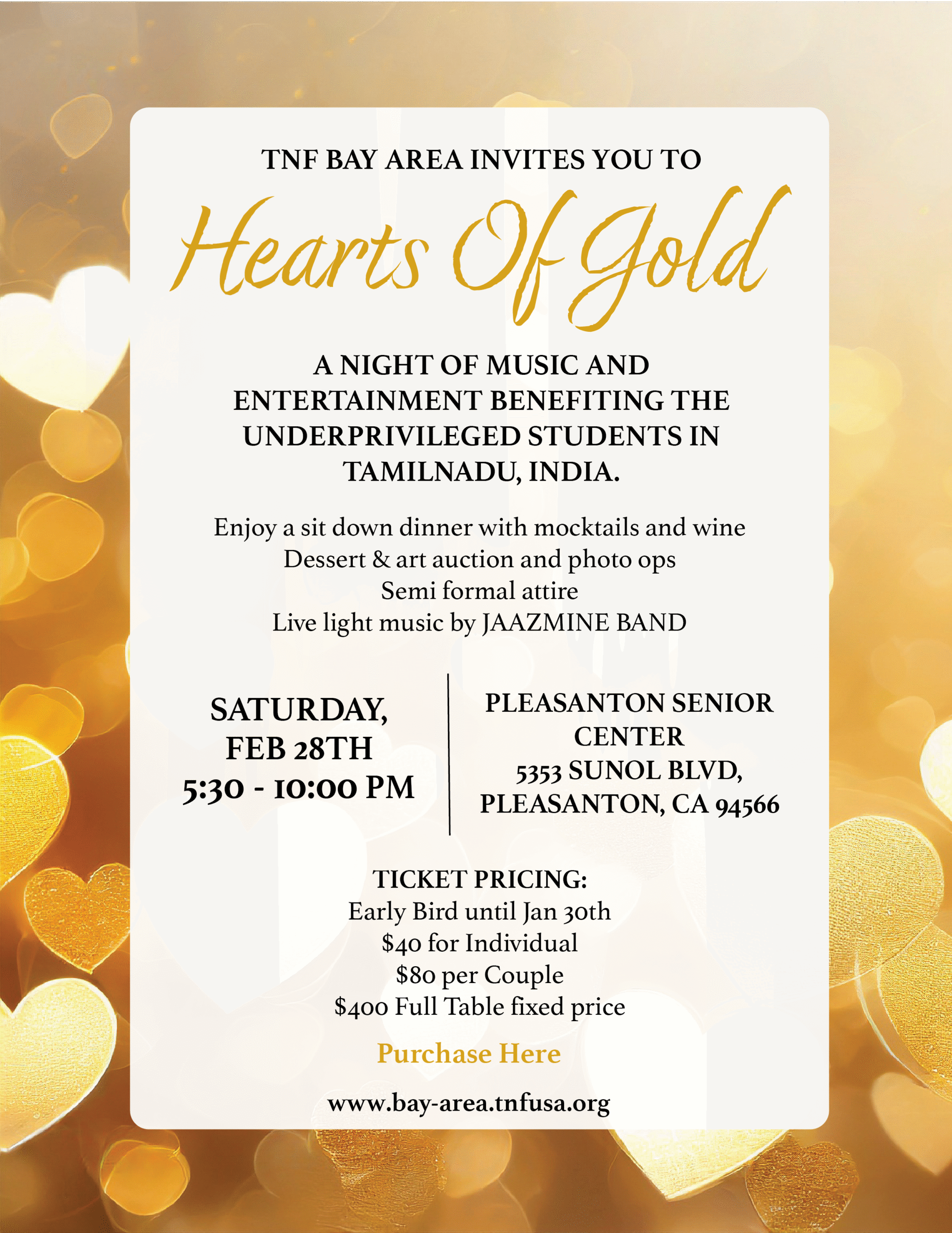 Your attendance directly supports the Tamil Nadu Foundation, Bay Area Chapter’s mission to help young school children in Chennai. Extend your New Year & Valentine’s celebrations with your hearts of gold – come share in the great music, delicious food & the joy of touching lives together. ✨