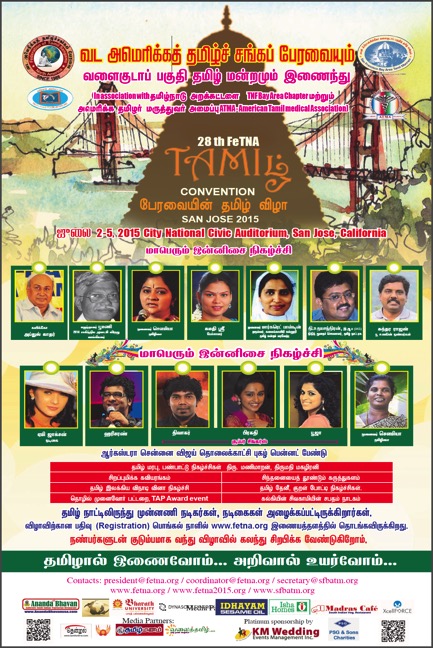 TNF’s 2015 General Body Meeting was organized by the TNF Bay Area Chapter during the 2015 Tamil Vizha and FETNA convention organized by the Bay Area Tamil Manram and FETNA at the City National Civic Auditorium, San Jose, CA, from July 2nd to 5th,