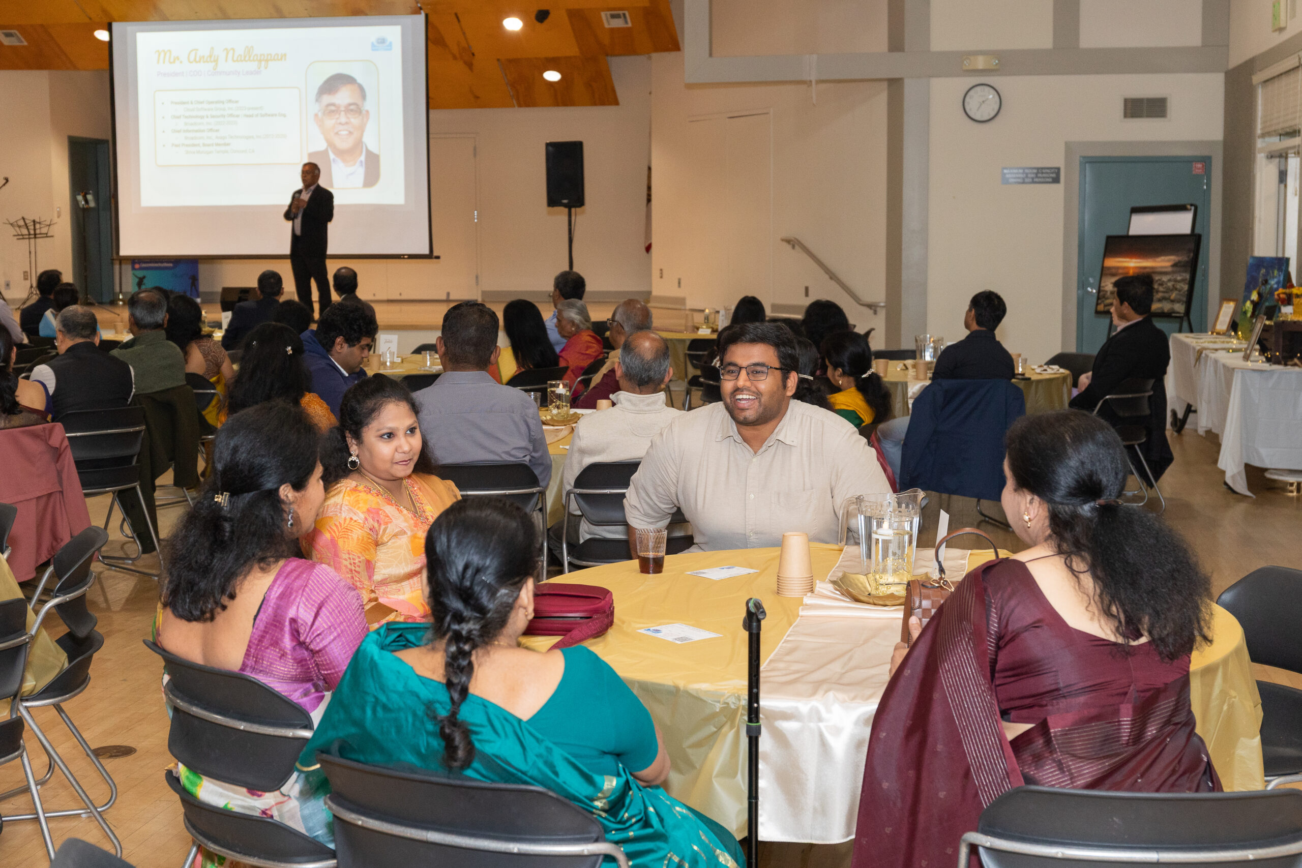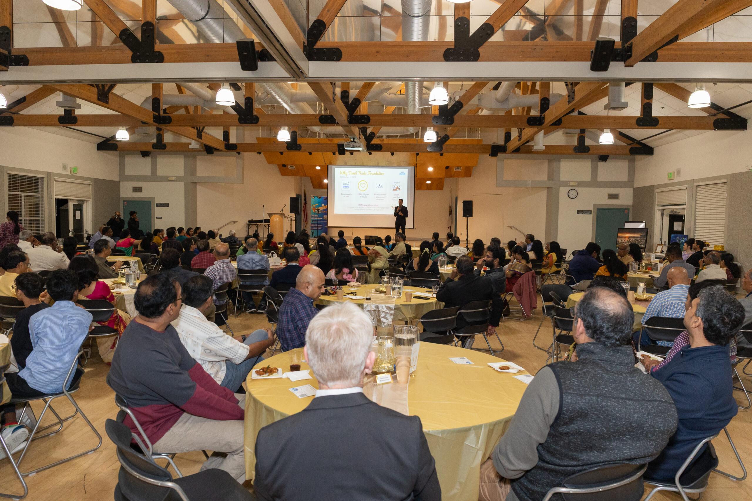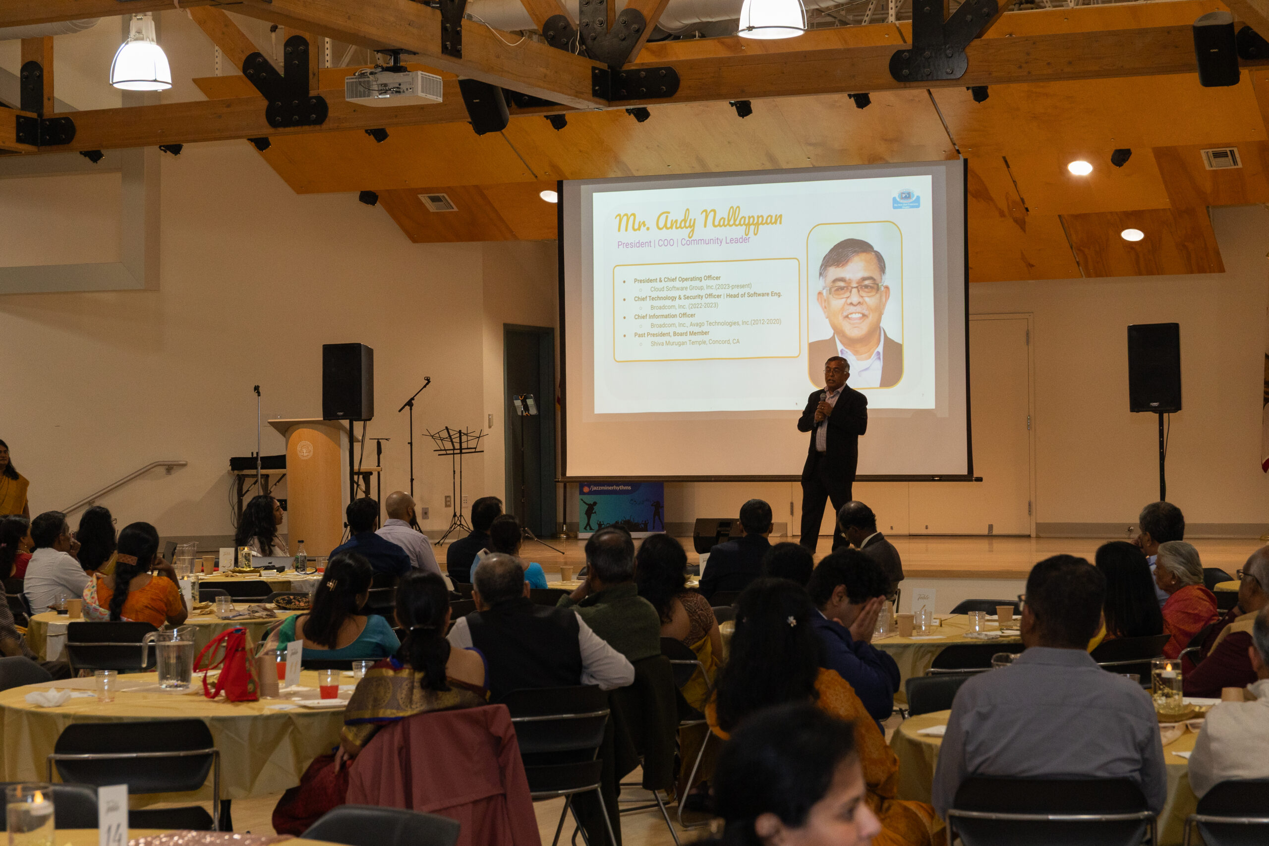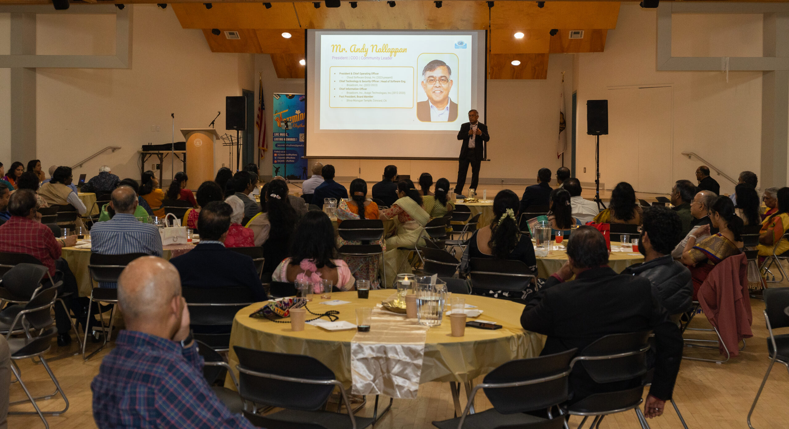 Our ~230 guests enjoyed inspiring words from Mr. M. R. Rangaswami (Founder at Indiaspora, CEF & Sand Hill Group), exquisite wines from V5 Vineyards, a delicious dinner from Annachi Kadai, and lively entertainment by a local Tamil Light Music band, Jazzmine.