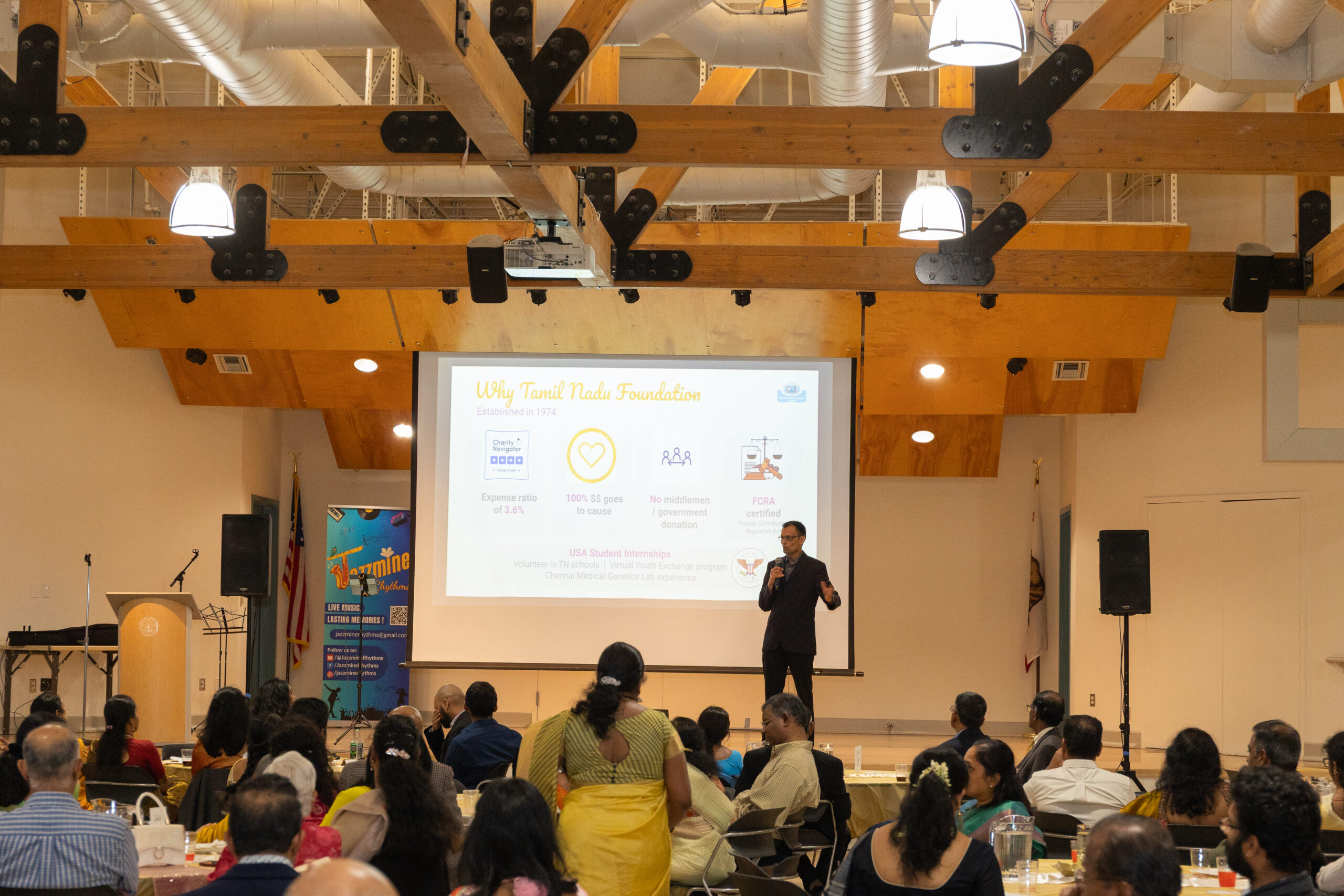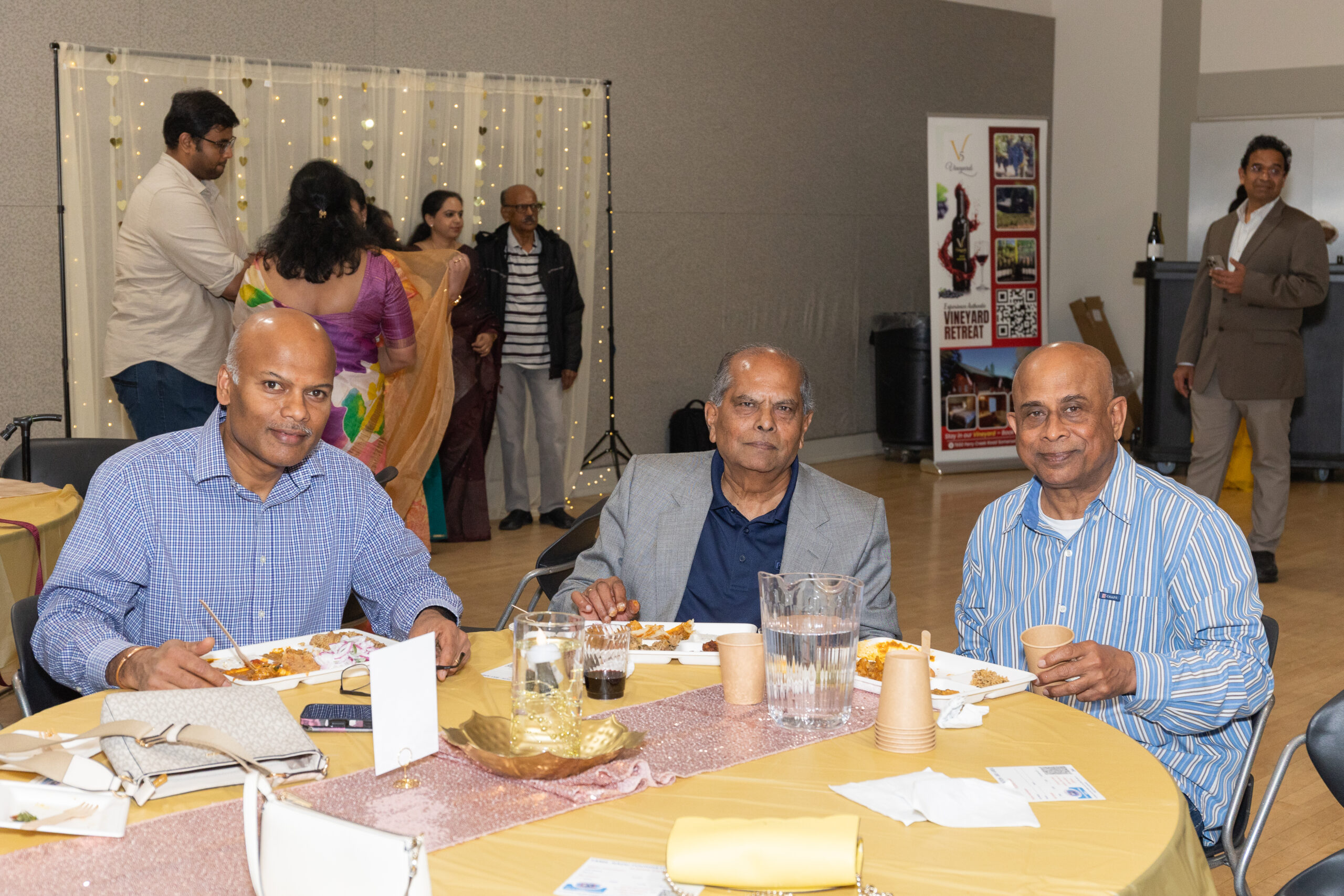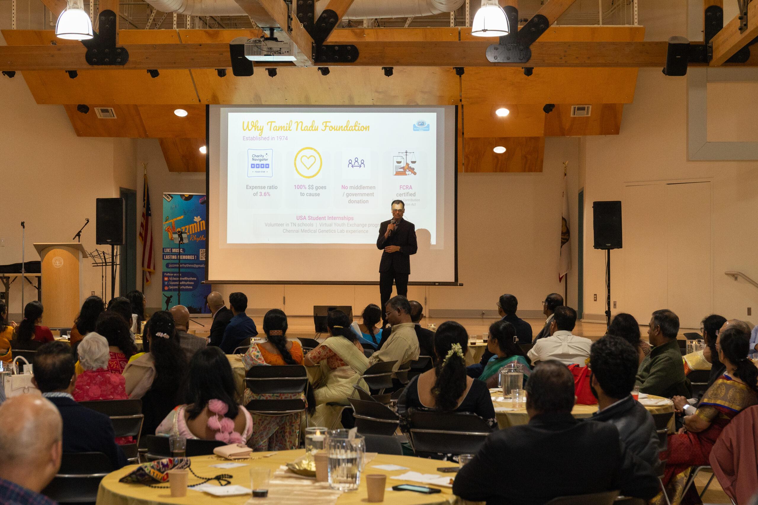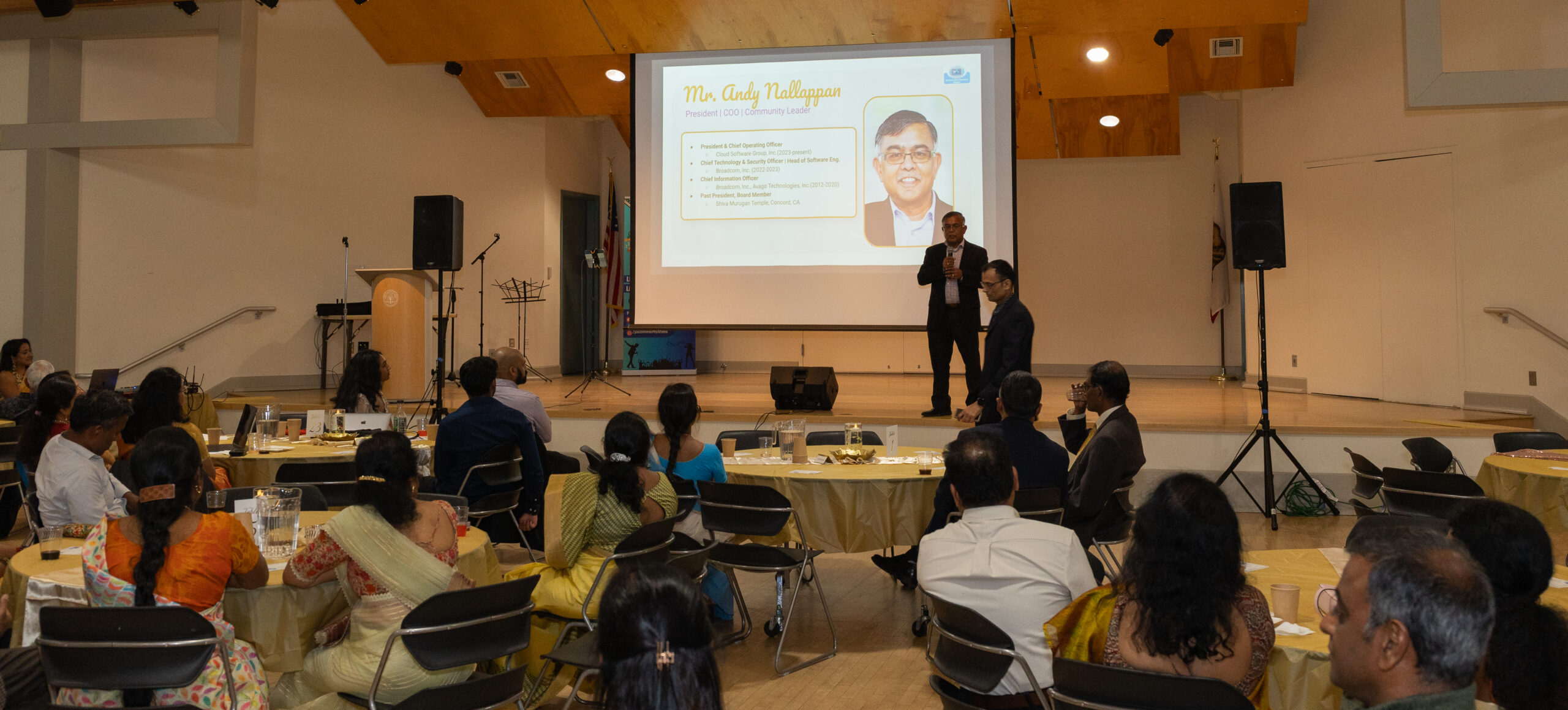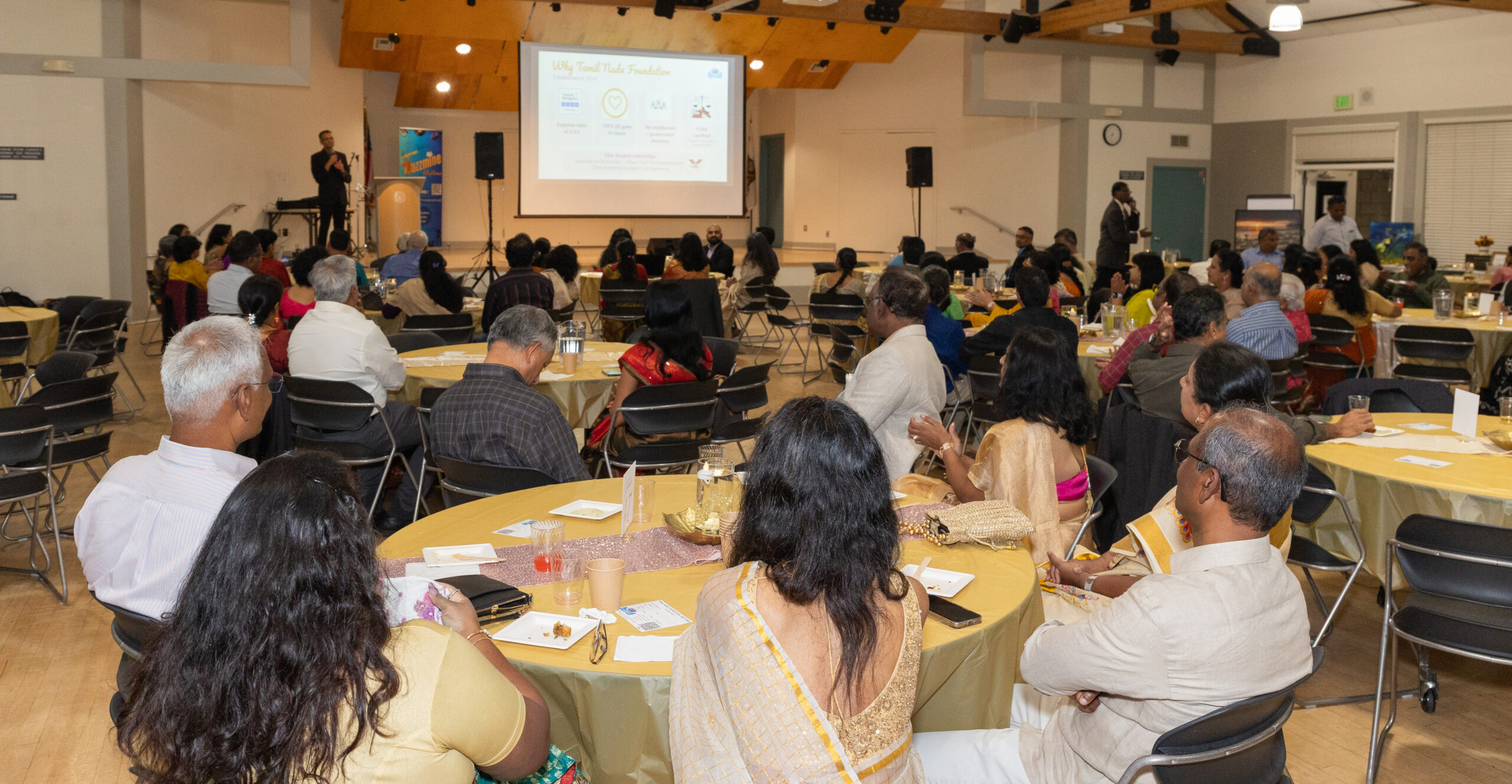 Our ~230 guests enjoyed inspiring words from Mr. M. R. Rangaswami (Founder at Indiaspora, CEF & Sand Hill Group), exquisite wines from V5 Vineyards, a delicious dinner from Annachi Kadai, and lively entertainment by a local Tamil Light Music band, Jazzmine.